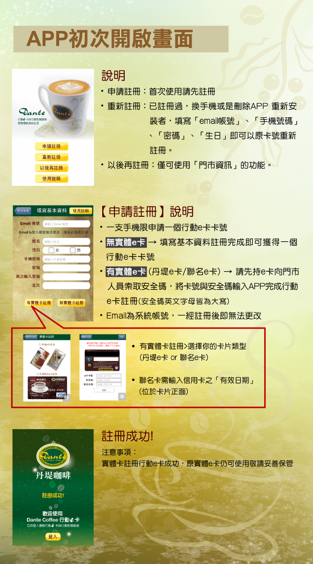 尚未使用e卡的消費者,歡迎使用手機下載行動點餐App,免費獲得行動e卡。已經擁有實體丹堤e卡的消費者,也歡迎下載App,將您手中的實體丹堤e卡卡號註冊成為手機中的行動e卡卡號(相同卡號),以便於同時使用儲值卡或手機消費。